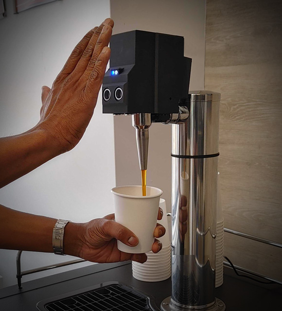 Our Touchless Tap uses advanced ultrasonic technology to detect when the hand and the cup are both in place before pouring a beverage.